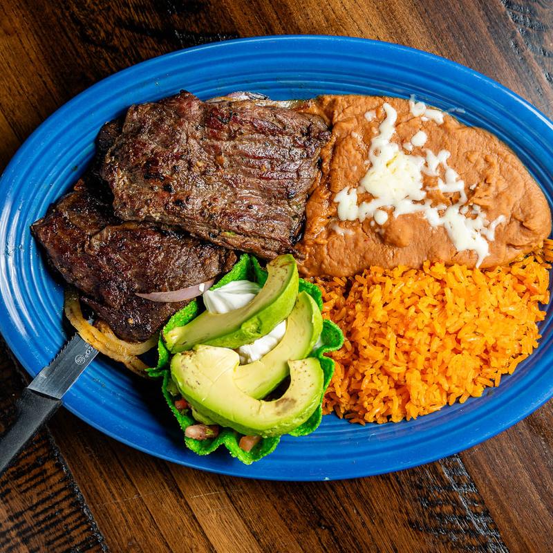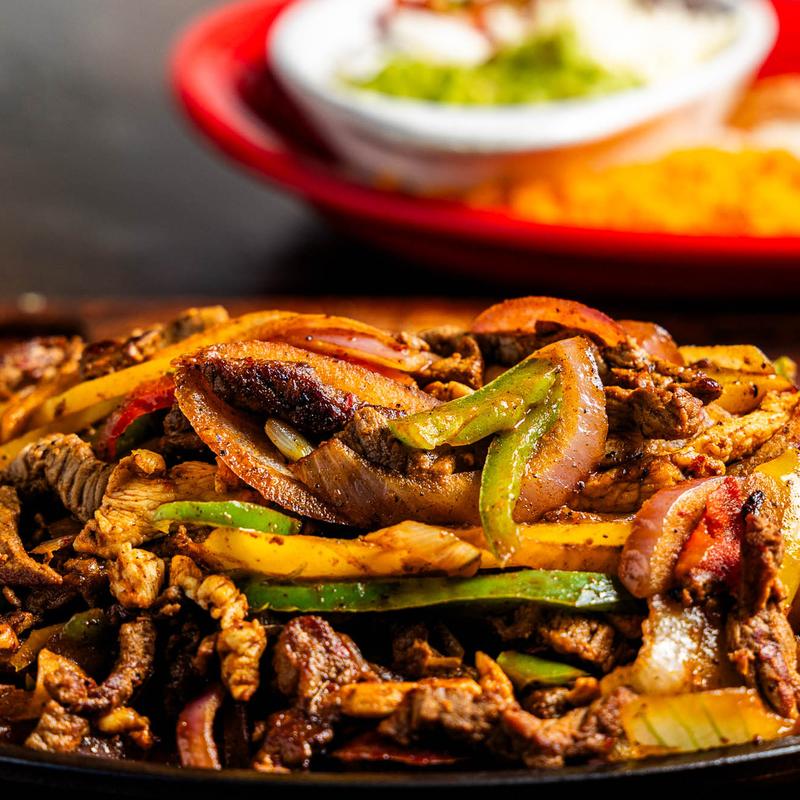 Marinated strips of beef, chicken, shrimp with fresh bell peppers, onions and spices, served with Mexican rice, refried beans, pico de Gallo, cheese, guacamole, sour cream and three flour tortillas.